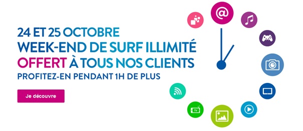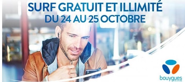 Bouygues Telecom offre régulièrement des Week-ends de Surf en illimité à ses abonnés, la dernière opération date du mois de Juillet 2015. Quel que soit le forfait détenu surfez en illimité durant ce Week-end du 24 au 25 octobre prochain. Et n’oubliez pas pour profiter de cette belle opération, il vous suffit d’éteindre et rallumer votre Smartphone si ce n’est pas encore fait.