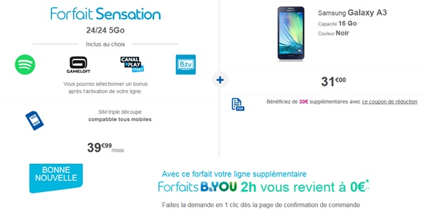 Pour rappel, le forfait Sensation associée à cette vente flash comprend les appels, SMS et MMS illimités en France ainsi que les SMS illimités vers les DOM. Profitez également avec cet abonnement des appels illimités vers les fixes de 120 destinations internationales. Le volume data est de 5Go jusqu’en 4G+ (débit réduit au-delà) en France et 5Go depuis l’Europe et les DOM valable 35 jours par an. Le bonus Sensation au choix parmi les services Spotify, CanalPlay Start, TV illimitée ou Gameloft est inclus. Les applications B.Tv avec un accès à + de 70 chaînes TV (décompté de l’enveloppe Internet en dehors du bonus Sensation), B cloud avec 20Go d’espace de stockage en ligne et World&You pour appeler et envoyer des SMS en illimité depuis le monde entier vers la France métropolitaine.