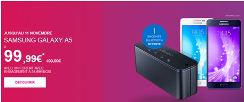 Le Samsung Galaxy A5 est en promo chez Virgin Mobile, profitez jusqu’au 100€ de réduction pour l’achat de ce Smartphone ainsi qu’une enceinte bluetooth Samsung EO-SG900 d’une valeur de 69.90€. Le constructeur Samsung vous offre une remise différée jusqu’à 50€ valable jusqu’au 31 décembre 2015 et Virgin Mobile vous rembourse jusqu’à 70€ et ce jusqu’au 17 Novembre 2015. Voici le prix du Samsung Galaxy A5 avec les promotions :