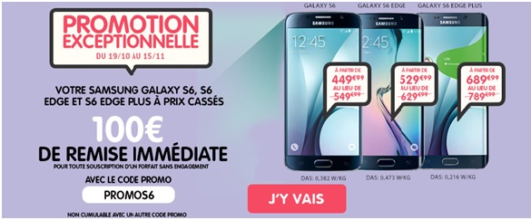 Et comme si cela ne suffisait pas à vous convaincre de chosir cet opérateur, NRJ frappe encore plus fort pour alléger votre porte monnaie, et offre une remise immédiate de 100€ jusqu'au 15/11/2015 pour tout achat d'un Samsung Galaxy S6, S6 edge ou S6 Edge+ en plus de la remise constructeur de 50€ ou 70€ valable jusqu'au 31/10/2015,