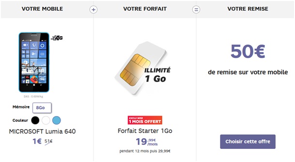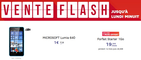 Le lumia 640 est en promo chez SFR à 1€ au lieu de 69.99€ en payant au comptant jusqu'à ce soir minuit, il ne vous reste donc plus que quelques heures pour profiter de la remise immédiate de 18.99€ avec la souscription à un forfait Starter 1Go en promo 19.99€ au lieu de 29.99€ par mois pendant 1 an. Profitez également de la remise différée de 50€ jusqu'au 16 Novembre 2015 pour l'achat de ce Lumia.