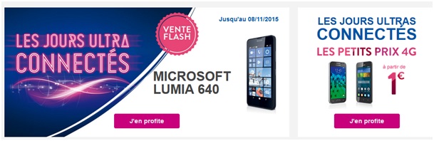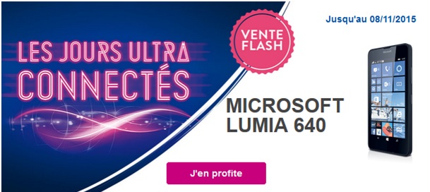 Le lumia 640 est en vente flash chez Bouygues Telecom à 29.90€ au lieu de 99.99€, l'opérateur vous offre une remise immédiate de 40€ pour l'achat de ce Smartphone entre le 03 et 08 Novembre 2015. De plus, une offre de remboursement différée de 50€ valable jusqu'au 22 Novembre 2015 est proposée pour l'achat du Lumia 640. Cette promotion est appliquée pour toute souscription à un forfait Sensation 2h + 1Go au prix de 19.99€ par mois avec engagement de 24 mois.