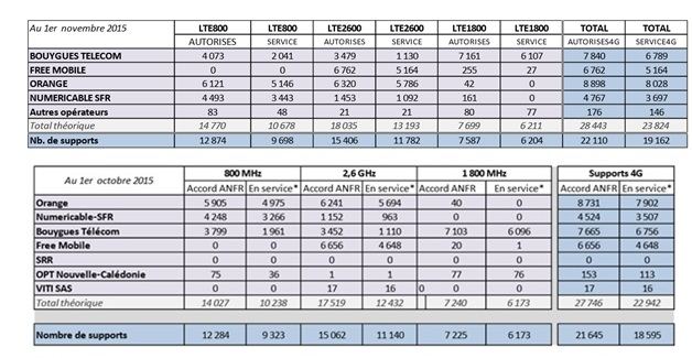 Au cours du mois d’octobre 2015, les sites mis en service ont connu un rythme plus soutenu avec notamment une hausse de 5,8 % dans la bande 2,6 GHz et 4% sur la bande 800 MHz. Free est le plus actif en octobre 2015 avec 516 nouveaux sites 4G en service. Les déploiements du quatrième opérateur sont très rapides depuis le mois de Mai 2015 et la tendance se poursuit de mois en mois. Les fréquences attribuées à Free permettent d’atteindre une vitesse maximale théorique de 150 Mbit/s.