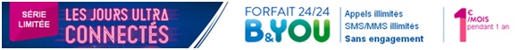 Bouygues Telecom propose le forfait illimité B&YOU sans engagement avec 20Mo de data à seulement 1€ et ce pendant 12 mois jusqu'au 22 Novembre 2015. Cette offre est réservée aux clients existants, dans le cadre d'une ouverture de ligne secondaire. Les nouveaux clients peuvent également en profiter en souscrivant à deux forfaits B&You simultanément.> Souscrire à un forfait Bouygues Telecom