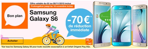 Orange propose jusqu’au 18 novembre 2015, une réduction immédiate de 70€ sur le Samsung Galaxy S6, Galaxy S6 Edge ou Galaxy S6 Edge Plus avec la souscription simultanée à un forfait Origami Play 8Go. > Acheter le Galaxy S6 avec Orange