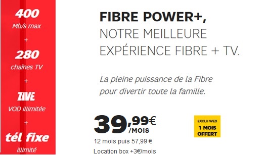 La Box Fibre Power+ est en promo pendant 12 mois au prix de 39.99€ au lieu de 57.99€ par mois et ce jusqu'au 27 janvier 2016.