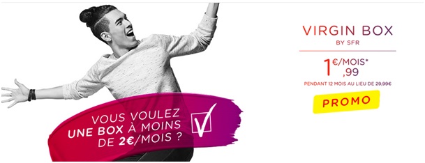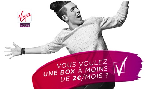 *Offre de remise limitée aux 5 000 premières souscriptions jusqu'au 24 novembre 2015, disponible uniquement sur le site internet virginmobile.fr, par téléphone au 1005 ou sur l’espace client sur virginmobile.fr pour les clients à une offre mobile. Tarif de la Virgin box de 1,99€/mois incluant une remise immédiate sur facture de 28€/mois applicable pendant 12 mois sur le prix de l’abonnement Virgin. Prix du service Virgin box au-delà de la période de remise de 12 mois : 29,99€/mois. Offre réservée aux nouveaux clients Virgin box sous réserve que la ligne Virgin box soit active (ni suspendue ni résiliée). Tarif remisé non compatible avec avantage multi-équipement HAPPY BOX (aucune réduction ne sera appliquée sur des lignes mobiles du fait de la souscription à cette offre tarif remisé pendant la période de la remise). Frais de mise en service Virgin box : 19,99€.