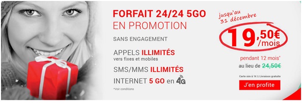 -Le forfait illimité + 5Go de data en 4G + Avantage Voyage est en promo à 19.50 au lieu de 24.50€ par mois,