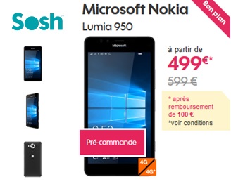 La promotion de 100€ est valable pour les nouveaux clients souscrivant à un forfait Sosh sans engagement à partir de 19.99€ par mois et à condition de rester client minimum deux mois. Le Lumia 950 est ainsi proposé au prix de 499 au lieu de 599€ avec cette remise différée de 100€