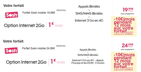 -Le forfait Sosh 24/24 +3Go en promo à 9.99€ au lieu de 19.99€ par mois et ce pendant 1 an intègre les appels illimités 24h/24 et 7j/7, les SMS et MMS illimités en France 24h/24 et 7j/7 et vers les DOM, les SMS illimités en déplacement en Europe et DOM et de la France vers l’Europe. Pour les usages data, vous profitez d'un accès Internet avec un volume de 3Go par mois en 4G (débit réduit au-delà). Profitez de 5Go de data en ce moment et à vie en ajoutant l'option 2Go à 1€ par mois.