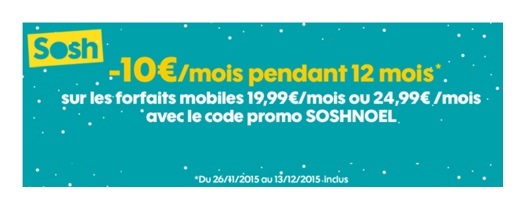 Sosh lance une nouvelle opération spéciale Noël et vous offre une remise de 10€ par mois et ce pendant 12 mois sur les deux forfaits illimités à partir de 19.99€ par mois. Cette promotion est valable pour toute souscription à un forfait Sosh entre le 26 novembre et 13 décembre 2015. Pour en profiter il vous suffit d’indiquer le code promo « SOSHNOEL » lors de la souscription.