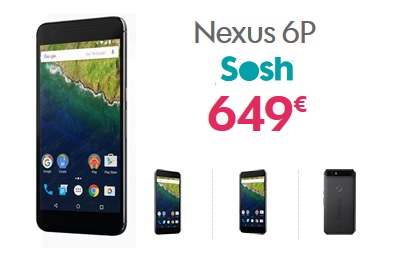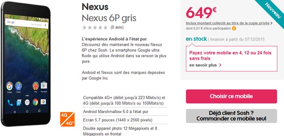 Le Nexus 6P est disponible chez Sosh à 649€ avec un forfait sans engagement à partir de 4.99€ par mois. Pour le paiement de votre Smartphone, la marque Low Cost d’Orange vous propose plusieurs possibilités soit de le régler au comptant ou encore en 4, 12 ou 24 fois sans frais.
