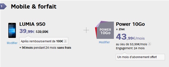 -259.99€ avec le forfait Power 15Go à 89.99€ par mois (200€ de remise différée soit le Lumia 950 à 59.99€),