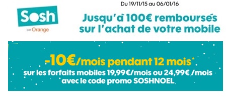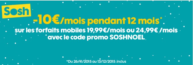 La remise de 10€ proposée par Sosh pour Noël sur les deux forfaits illimités 3Go et 5Go sans engagement est valable jusqu’au 13 décembre 2015. Cette réduction est appliquée pendant 1 an et pour en bénéficier vous devez indiquer le code promo « SOSHNOEL » lors de la souscription.