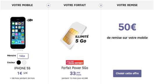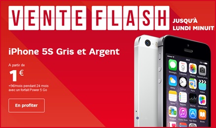 SFR réitère la vente flash de la semaine dernière pour l'achat d'un iPhone 5S. Profitez d'une remise immédiate de 48.99€ ainsi qu'une réduction différée de 50€ ce Week-end sur l'iPhone 5s entre le 11 et 14 décembre pour toute souscription au forfait Power 5Go en promo pendant 12 mois à partir de 33.99€ par mois. Grâce aux deux promotions, l'iPhone 5s est au prix de 1€ au lieu de 99.99€ à la commande puis 8€ par mois 24 mois avec le paiement en 24 fois sans frais (51€ à régler lors de la souscription soit 1€ avec la réduction de 50€). En choisissant de le payer au comptant, l'iPhone 5s est en promo à 121€ au lieu de 219.99€ (171€ à régler à la commande soit 121€ avec la réduction différée de 50€ valable jusqu'au 04 janvier 2016).
