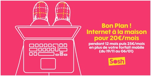 L’opérateur Sosh vous propose une autre offre promotionnelle valable également jusqu’au 6 janvier prochain. Plus précisément, les nouveaux clients Sosh mobile + Livebox peuvent profiter de l’Internet à la maison pour 20€ par mois pendant 12 mois, puis 25€ par mois en plus de votre forfait mobile, grâce à l’offre de remboursement de 5€ par mois. Cette remise est valable jusqu'au 06 janvier 2016 pour toute première souscription à un forfait de la gamme Sosh mobile + Livebox en version ADSL ou fibre. Pour en bénéficier, il vous suffit de renvoyer le coupon dûment complété accompagné des pièces justificatives requises.