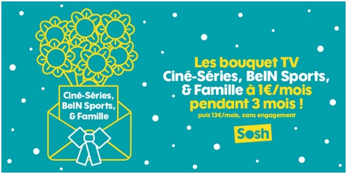 Avec Sosh, vous bénéficiez de BeIN sport ou du bouquet ciné séries, ou du bouquet famille à 1€ par mois pendant 3 mois. Cette offre est valable jusqu’au 6 janvier prochain. Après 3 mois, le bouquet Famille est facturé 10€ par mois, 13€ par mois pour BeIN Sports et le bouquet Ciné Séries. Attention, ces promotions sont non cumulables entre les bouquets ! Cette offre de découverte est réservée aux nouveaux clients qui n’ont pas souscrit à un bouquet de la même thématique dans les 6 mois précédant la souscription.
