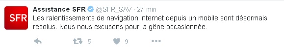 L'opérateur a publié toujours sur son compte Twitter un message à ses clients indiquant que les ralentissements de navigation internet depuis un mobile étaient terminés.