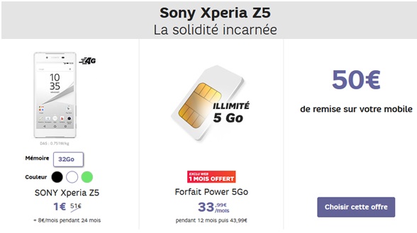 Pour l’achat du Sony Xperia Z5 entre le 18 et 21 décembre 2015, SFR vous offre une remise immédiate de 28.99€ ainsi qu’une remise différée de 50€ valable jusqu’au 04 janvier 2016.