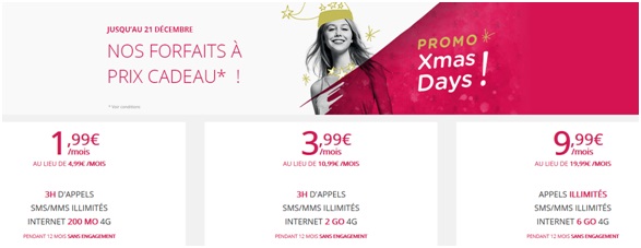 L’opération Xmas Days avec trois forfaits Virgin Mobile à prix cadeau touche à sa fin ce soir 21 décembre minuit. Vous pouvez encore profiter d’un forfait mobile sans engagement à partir de 1.99€ par mois pendant encore quelques heures et la data est doublée à vie pour ces trois formules sans engagement. Voici un rappel des offres en promo pendant 1 an chez Virgin Mobile :
