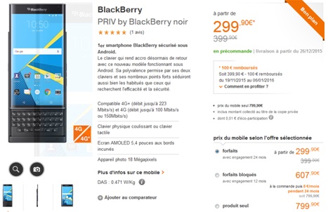 Orange vous offre une remise différée de 100€ pour l’achat du tout dernier BlackBerry. Le PRIV est ainsi proposé à partir de 299.90€ au lieu de 399.90€ jusqu’au 05 janvier 2016. Pour bénéficier de ce tarif pour l’achat de ce Smartphone, vous devez souscrire au forfait Origami Jet avec engagement de 24mois à partir de 59.99€ chez Orange.