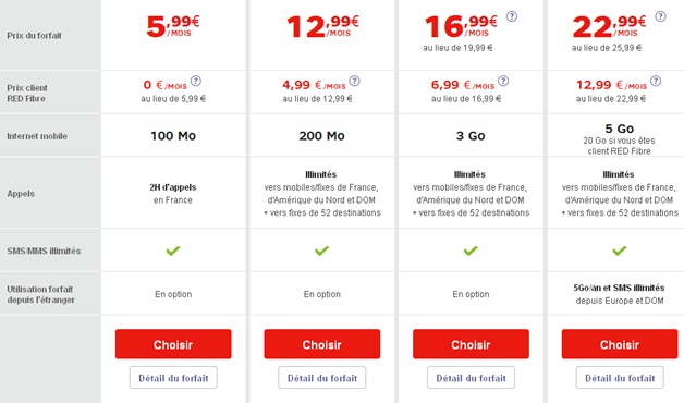 Avec le forfait facturé à 16.99€ par mois pendant 6 mois puis 19.99€ par mois, vous bénéficiez de 3 Go d’internet en 4G. Le forfait illimité à 22.99€ par mois pendant 6 mois au lieu de 25.99€ intègre 5 Go d’internet mobile en 4G/Dual Carrier/3G+ (débit réduit au-delà) ainsi que 5 Go par an d’internet depuis l’Europe et les DOM. Autre avantage, si vous êtes client RED Fibre, vous profitez avec ce forfait de 20 Go de data.