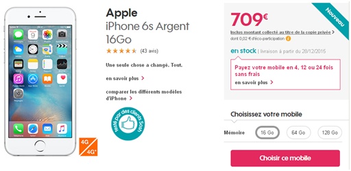 L’opérateur Sosh vous propose d’acquérir l’iPhone 6S 16Go en plusieurs fois sans frais ! Vous avez la possibilité de le payer en 4, 12 ou 24 fois sans frais. Ce dernier est au prix de 709€ soit 29.55€ par mois si vous optez pour le paiement en 24 fois sans frais. L’iPhone 6S est disponible chez cet opérateur en gris sidéral, argent ou or.