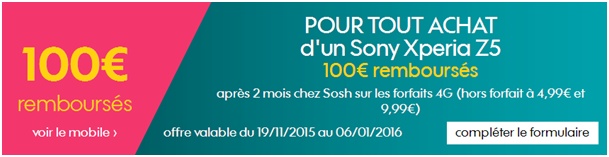 L’opérateur Sosh vous propose jusqu’au 6 janvier prochain un remboursement de 100€ pour tout achat d’un Sony Xperia Z5, un smartphone aux performances multimedia impressionnantes. Cette offre est valable pour l’achat de ce Sony avec un forfait 4G Sosh (hors forfait à 4.99€ et 9.99€). Pour en profiter, il vous suffit de renvoyer le coupon de remboursement avec les pièces demandées, soit votre mobile à 599 € au lieu de 699 € après le remboursement différé.