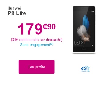 L’opérateur Bouygues Telecom vous propose actuellement une offre de remboursement de 30€ sur le Huawei P8 Lite. Ce smartphone vous revient donc à 179.90€ au lieu de 209.90€ avec un forfait sans engagement de Bouygues Telecom après le remboursement différé. Pour en profiter, il vous suffit de renvoyer le coupon de participation sur Internet ou par courrier avec les pièces justificatives demandées. Vous recevrez votre remboursement dans un délai de 8 semaines maximum à compter de la date de votre demande conforme et complète.
