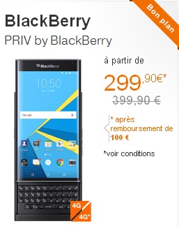 Orange vous propose actuellement le Blackberry PRIV à 299.90€ au lieu de 399.90€ grâce à un remboursement différé de 100€. Pour bénéficier de ce tarif pour l’achat de ce smartphone, vous devez souscrire au forfait Origami Jet avec engagement de 24 mois à partir de 59.99€ chez Orange.