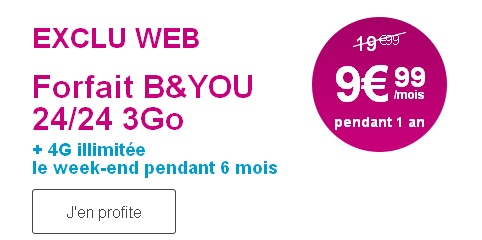 Bouygues Telecom propose actuellement et pour toute souscription avant le 10 janvier prochain, une remise de 10€ par mois pendant un an sur les forfaits B&YOU sans engagement 3Go et plus. Vous pouvez donc bénéficier du forfait B&YOU 24/24 3Go de Bouygues Telecom à seulement 9.99€ par mois pendant 12 mois au lieu de 19.99€.