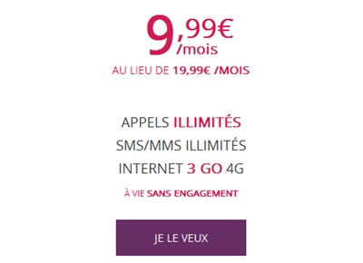 Ce forfait comprend les appels illimités vers 67 destinations fixes et mobiles. Les SMS et MMS sont également illimités (99 destinataires différents max par mois). Vous disposez d’internet mobile 4G avec un volume data de 3Go (débit réduit au-delà). Autre avantage, ce forfait à moins de 10€ par mois comprend les appels, SMS et Internet en illimité depuis l’Europe et les DOM tous les week-ends.