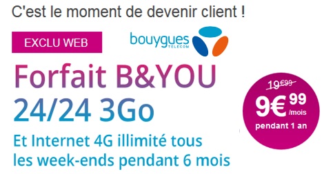 -Le forfait B&You 24/24 + 5Go est en promo à 19.99€ au lieu de 29.99€ par mois,