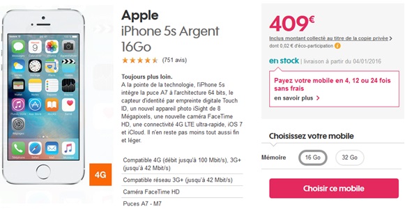 -511.99€ avec un forfait Virgin Mobile, le prix à la commande est 100 plus cher que chez Sosh mais en ce moment Virgin Mobile brade trois forfaits illimités et des prix valables à vie, si 1Go d’internet vous suffissent, le forfait illimité + 1Go est en promo à 5.99€ par mois à vie, ou encore avec 3Go de data à 9.99€ par mois et pour les gros utilisateurs d’internet sur le mobile, une édition spéciale avec les appels, SMS et MMS illimités et 20Go de data est actuellement proposée au prix de 15.99€ par mois et à vie. Ces offres lancées dans le cadre de l’opération les journées XD sont valables jusqu’au 05 janvier 2016 ., 1Go à 5.99€, 3Go à 9.99€ ou encore 20Go à 15.99€, des prix valables à vie, Acheter l'iPhone 5s chez Virgin Mobile