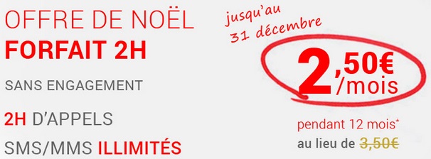 -Le forfait 2h est en promo à 2.50€ pendant 12 mois puis 3.50€. Cette offre adaptée à des utilisateurs peu bavards comprend 2h de communications pas mois ainsi que les SMS et MMS illimités, les usages Internet sont possibles et facturés 0.05€/Mo.