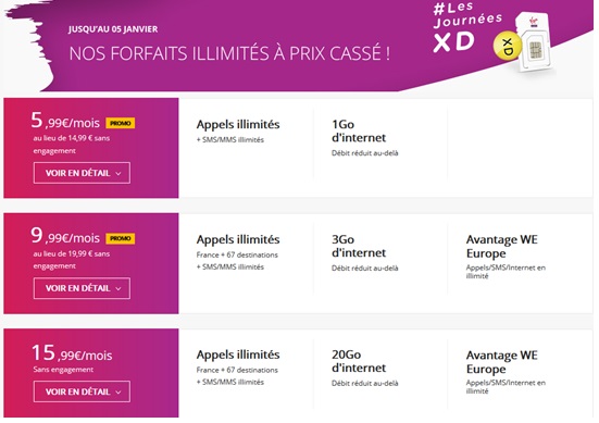Les trois forfaits illimités proposés dans le cadre de l'opération les journées XD avec 1Go, 3Go ou encore 20Go de data pour vos usages Internet sur votre Smartphone, avec des remises jusqu'à 10€ par mois et à vie sont disponibles jusqu'à demain 05 janvier minuit. Il ne vous reste donc un peu plus d'un jour pour profiter d'une offre avec appels, SMS et MMS illimités en France et 1Go de data à seulement 5.99€ par mois au lieu de 14.99€ par mois ou avec 3Go de data à 9.99€ au lieu de 19.99€ ou encore pour bénéficier d'un forfait tout illimité avec cette fois 20Go d'internet à 15.99€ par mois à vie.