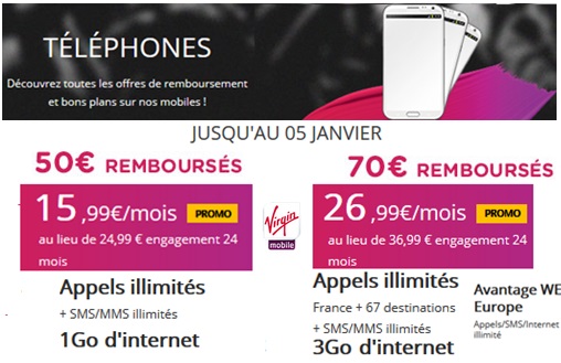 Grâce aux promos proposées actuellement chez Virgin Mobile, vous bénéficiez d'une remise de 10€ par mois à vie sur votre forfait illimité avec 3Go de data ainsi qu'une réduction différée de 70€ pour l'achat d'un Smartphone. En cumulant ces deux promotions, le Galaxy S6, S6 Edge ou S6 Edge + sont à des prix très attractifs. L'offre de remboursement différée de 70€ est valable pour toute souscription au forfait illimité 3Go avec engagement de 24 mois ou encore 50€ de réduction avec le forfait 24/24 + 1Go sur 24 mois. Cette réduction jusqu’à 70€ s’applique également sur d’autres Smartphones.