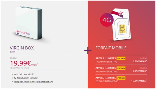 Cet opérateur propose actuellement une remise exceptionnelle sur son offre Virgin Box à 19.99€ par mois pendant un an au lieu de 29.99€. Vous pouvez donc associer votre forfait à votre offre box et ainsi profiter de tarifs exceptionnels. Par exemple, vous pouvez profiter d’une Virgin Box ainsi que d’un forfait illimité à partir de seulement 25.98€ par mois.