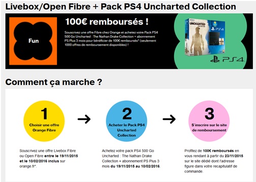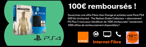Orange prolonge l’opération pour l’achat d’un pack PS4 Uncharted auprès des enseignes participantes jusqu’au 10 février 2016 avec la souscription à un abonnement Livebox Fibre chez Orange actuellement en promo à partir de 19.99€ par mois pendant 1an. Orange vous rembourse 100€ sur votre Play Station 4 500Go Uncharted : The Nathan Drake Collection + abonnement PS Plus 3 mois. Les enseignes éligibles pour l’achat de votre pack PS4 Nathan Drake Collection sont Micromania, Fnac, Auchan, Carrefour, Amazon, Cdiscount, Leclerc, Boulanger, Cora, Cultura, Rue du commerce, Toys ‘R’ Us et Casino.