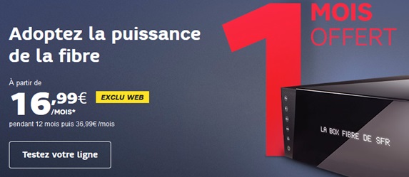 -La Box Fibre Starter de SFR est en promo à 16.99€ la première année avec 3€ de plus par mois pour la location de la Box puis à 39.99€ par mois (box incluse). Bénéficiez également d’un mois offert en exclu Web et jusqu’à 100€ remboursés sur vos frais de résiliation de votre ancien fournisseur d’accès à Internet.