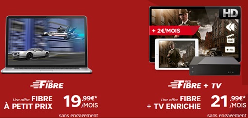 Le modem RED Fibre obligatoire est mis à disposition et le décodeur TNT obligatoire pour accéder aux chaînes incluses sans option TV n’est pas fourni. L’offre RED Fibre by SFR est sans engagement avec des frais de résiliation de 49€. Dans le cadre d’un changement de fournisseur d'accès à Internet RED By SFR vous rembourse jusqu'à 100€ vos frais de résiliation jusqu'au 25 janvier 2016.