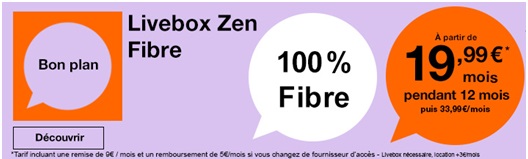 La livebox Zen Fibre est sans engagement avec des frais de résiliation de 50€ et l’installation de la Fibre à domicile est incluse. Le Boîtier Fibre optique est mis à disposition et la Livebox est à 3€/mois en location. Le décodeur Mpeg4 avec récepteur TNT et carte d’accès TV sont mis à disposition sous réserve d’un dépôt de garantie de 49€. Si vous n'êtes pas éligibles à la fibre, la Livebox Zen ADSL/VDSL est en promo à 28.99€ au lieu de 33.99€ par mois dans le cadre d'un changement de fournisseur d'accès Internet.