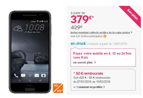 Sosh, la marque low-cost d’Orange vient de baisser le prix du smartphone HTC One A9. En effet, ce dernier est désormais disponible à 429€ avec un forfait Sosh au lieu de 599€ soit une réduction de 170€.