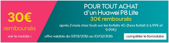 L’opérateur Sosh vous rembourse 30€ pour l'achat du Huawei P8 Lite jusqu'au 10 février prochain. Cette offre de remboursement est valable pour toute souscription à un forfait illimité Sosh sans engagement à partir de 19.99€ par mois. Grâce à ce remboursement sur demande, le Huawei P8 Lite vous revient à 179€ au lieu de 209€. Pour profitez de cette offre de remboursement différée, il suffit renvoyer le bulletin de participation avec les justificatifs demandés. Vous recevrez votre récompense dans les deux mois suivant la réception de votre dossier.
