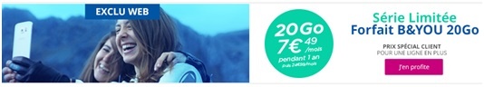 La nouvelle Série Limitée B&YOU 20Go de Bouygues Telecom est réservée aux nouveaux clients. Les clients Bouygues Telecom détenant un forfait sans engagement B&YOU peuvent opter pour ce forfait 20Go mais au prix de 24.99€ par mois ou encore à 22.50€ avec la remise multi-ligne. En revanche, si vous souhaitez une ligne en plus, vous pouvez bénéficier d’un prix spécial client. Plus précisément, votre seconde ligne avec la Série Limitée 20Go est à 7.50€ par mois pendant 1 an puis 22.50€. C’est donc le moment d’en profiter si vous souhaitez équiper un proche.