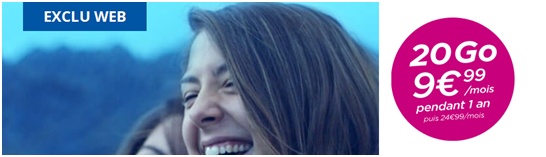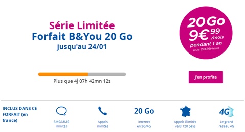Depuis le 15 janvier dernier, Bouygues Telecom propose une nouvelle Série Limitée 20Go à seulement 9.99€ par mois pendant un an puis 24.99€. Ce forfait sans engagement comprend les appels illimités vers les fixes et les mobiles ainsi que les SMS et MMS illimités en France métropolitaine et SMS illimités vers les DOM. Autre avantage avec ce forfait, vous bénéficiez des appels illimités vers 120 pays.