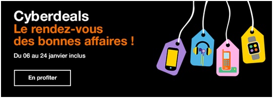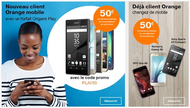 Dans le cadre de l’opération Cyberdeals, l’opérateur Orange vous offre du 6 au 24 janvier prochain, une remise immédiate de 50€ sur le smartphone de votre choix avec la souscription simultanée à un forfait Origami Play. Pour profiter de cette remise immédiate, il vous suffit de sélectionner votre forfait Origami Play ainsi que votre smartphone et enfin de saisir le code promo PLAY50 à l’étape panier.