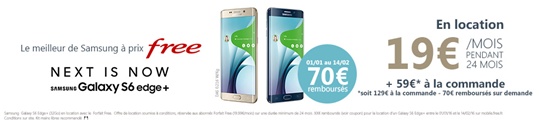 Envie d’un nouveau smartphone premium ? Profitez actuellement d’un remboursement différé de 70€ pour l’achat ou la location chez l’opérateur Free Mobile d’un Samsung Galaxy S6 edge plus. Le Samsung Galaxy S6 edge plus est proposé chez cet opérateur à 129€ à la commande soit 59€ après remboursement puis 19€ par mois en location avec un engagement de 24 mois.