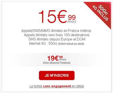 Pour la partie Internet, ce forfait intègre jusqu’à 50 Go en 4G valable sur réseau 4G et avec terminal 4G (dans la limite de 20 Go en 3G avec un terminal 4G). Avec un terminal non compatible 4G et sur réseau 3G, jusqu’à 3 Go en 3G. Le forfait illimité de Free Mobile est au prix de 19.99€ par mois ou 15.99€ pour les abonnés Freebox.