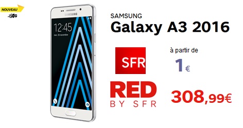 Annoncé en décembre 2015, le successeur du Galaxy A3 est désormais disponible avec la souscription à un forfait SFR ou encore avec un forfait RED BY SFR à partir de 5.99€ par mois. En choisissant un forfait de la marque Low Cost de SFR, le Galaxy A3 2016 est proposé au prix de 308.99€. Red vous propose actuellement des promos sur ses formules illimitées pendant 6 mois.